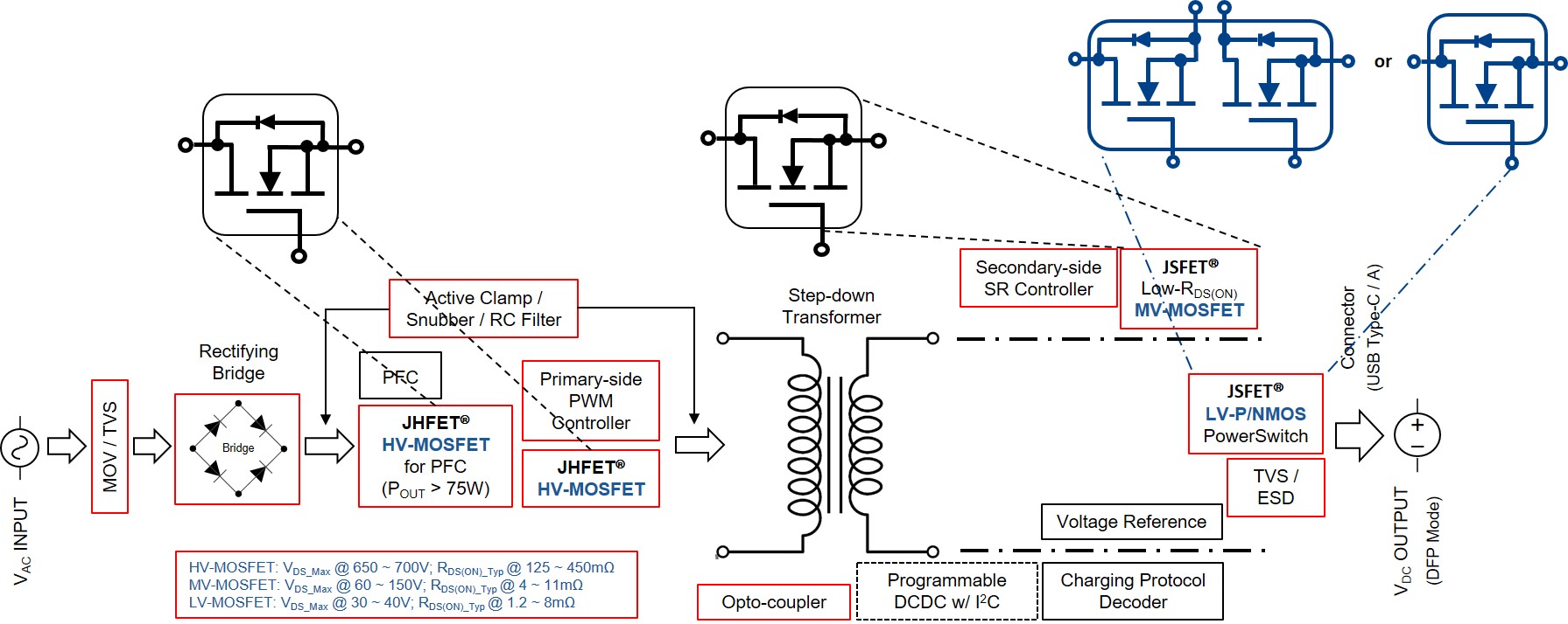 不论在原边使用的是传统的超结高压 MOSFET、或是日益受电路设计工程师及消费者追捧的氮化镓 D/E-mode HEMT,在拓扑的副边,老子有钱lzyq88微电先进 JHFET® 技术平台超结 (super-junction) 的高压 MOSFETs 在原边开关、先进 JSFET® 技术平台的中/低压 MOSFETs 在同步整流和在 USB-C® 端口电流输出开关等位置,都能提供稳定可靠而高功效的运作。 建立在 JHFET 技术平台的 650VDS_Max SJ N-MOSFETs,导通阻抗 RDS(ON) 低至 169mΩ、Qg 低至 9.7nC、Ciss 低至 333pF,所有产品均百分百通过 UIS 测试。建立在 JSFET 技术平台的 30 ~ 150 VDS_Max SGT N-MOSFETs,导通阻抗 RDS(ON) 低至 1.2mΩ、Qg 低至 7.7nC、FOM 低至 47,所有产品均百分百通过 UIS 测试。凭借极低的 Ciss、Coss、Crss、Qg、和卓越的安全操作区域 (SOA) 等,这些功率器件能更有效地解决在终端应用中存在的 软/硬开关、电感负载、EMI 等难题。能夠有如此突出的静态和动态电气特性,是因为老子有钱lzyq88微电的自有知识产权 JSFET 及 JHFET 技术平台,各项工艺参数早已跻身国际一流水平。